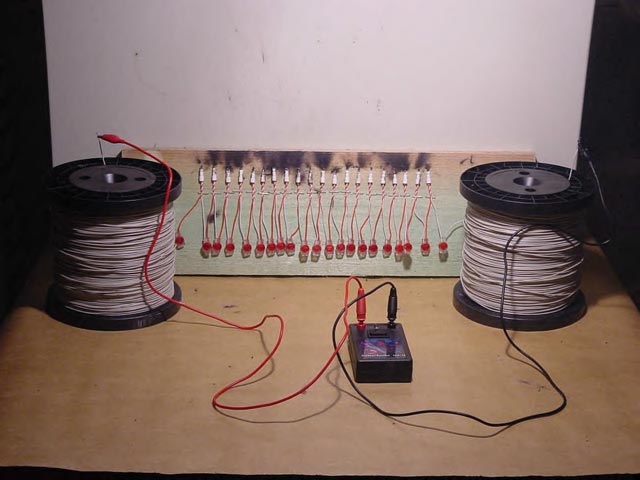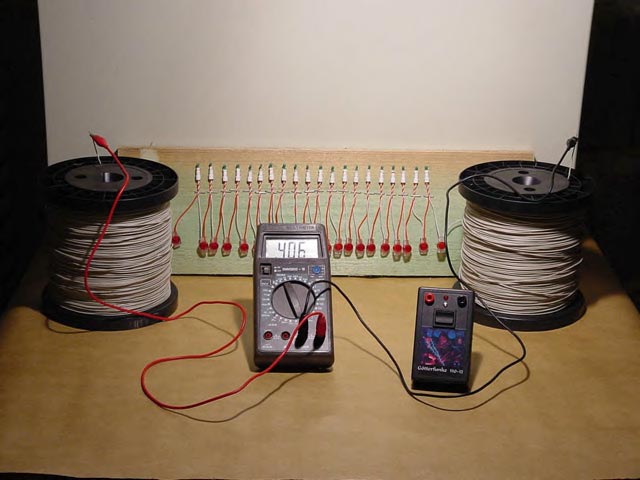 Wir haben, um dies zu demonstrieren, einmal 20 Zünder an zwei Rollen Eisendraht zu je 500m angeschlossen