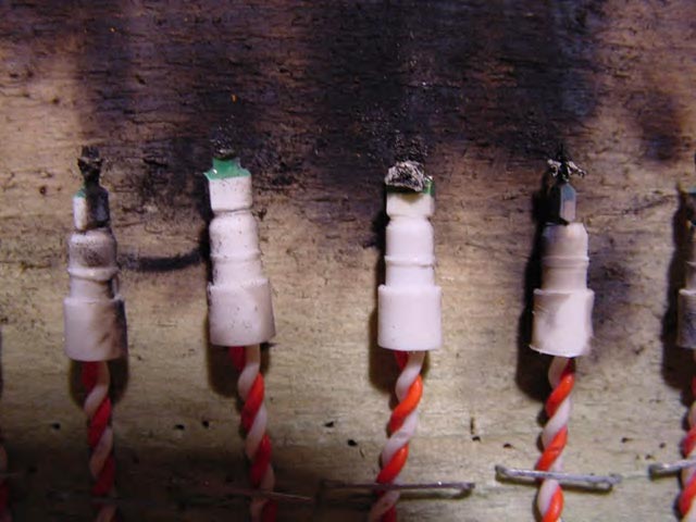 (2) Schaltet man mehrere Zünder parallel, so fließt durch den Ast mit dem geringsten Widerstand der größte Strom. Das hieße zum Beispiel, ein Ast mit 15Ohm würde von dem zehnfachen Strom durchflossen wie ein parallel geschalteter Ast von 150Ohm. Natürlich würde der erste Zünder dann wesentlich schneller zünden als der zweite. Nun kann folgendes passieren: Nachdem der erste Zünder gezündet hat, verschmelzen dessen Kontakte zu einem Kurzschluss. Das kann immer passieren, insbesondere in der Pyrotechnik, da sich die Zünder immer in der Nähe von Schwarzpulver befinden, dessen geschmolzene Reaktionsprodukte hervorragende Leiter für Strom darstellen.